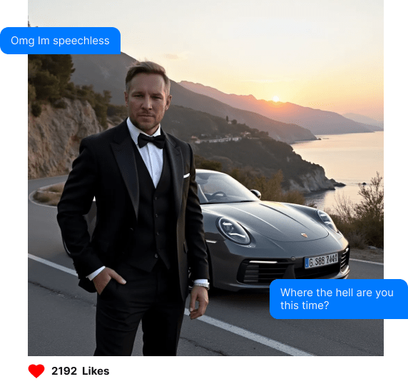 No need to rent expensive props or locations. Create stunning photos with luxury cars, mansions, designer clothing, exotic locations, and professional equipment - all without the hassle and cost of acquiring them in real life.